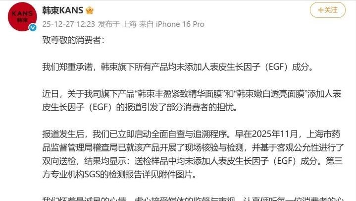 随后紧急声明称生产过程中未主动添加EGF成分。