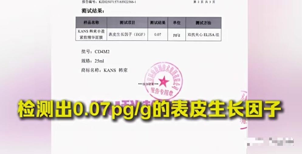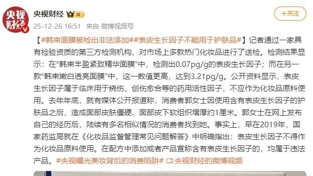 节目指出,韩束旗下两款热销面膜中检出国家明令禁止添加的EGF成分。